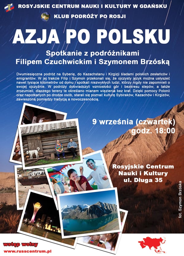 W dn. 9 września 2010 o g. 18.00 Rosyjskie Centrum Nauki i Kultury w Gdańsku zaprasza na spotkanie z podróżnikami Filipem Czuchwickim i Szymonem Brzóską pt. “Azja po polsku”. Wstęp wolny.