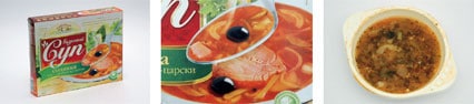 Для рекламы супов в пакетиках варят настоящий суп. Но если просто налить его в тарелку и снимать, не будет ничего видно, все ингредиенты утонут. Поэтому на дно кладется слой прозрачного желатина, сверху наливается бульон или обычная вода, а потом уже аккуратно выкладывается капуста, слегка обжаренная ветчина, маслины, петрушка и овощи. Главное — создать впечатление богатого набора витаминов.
